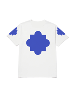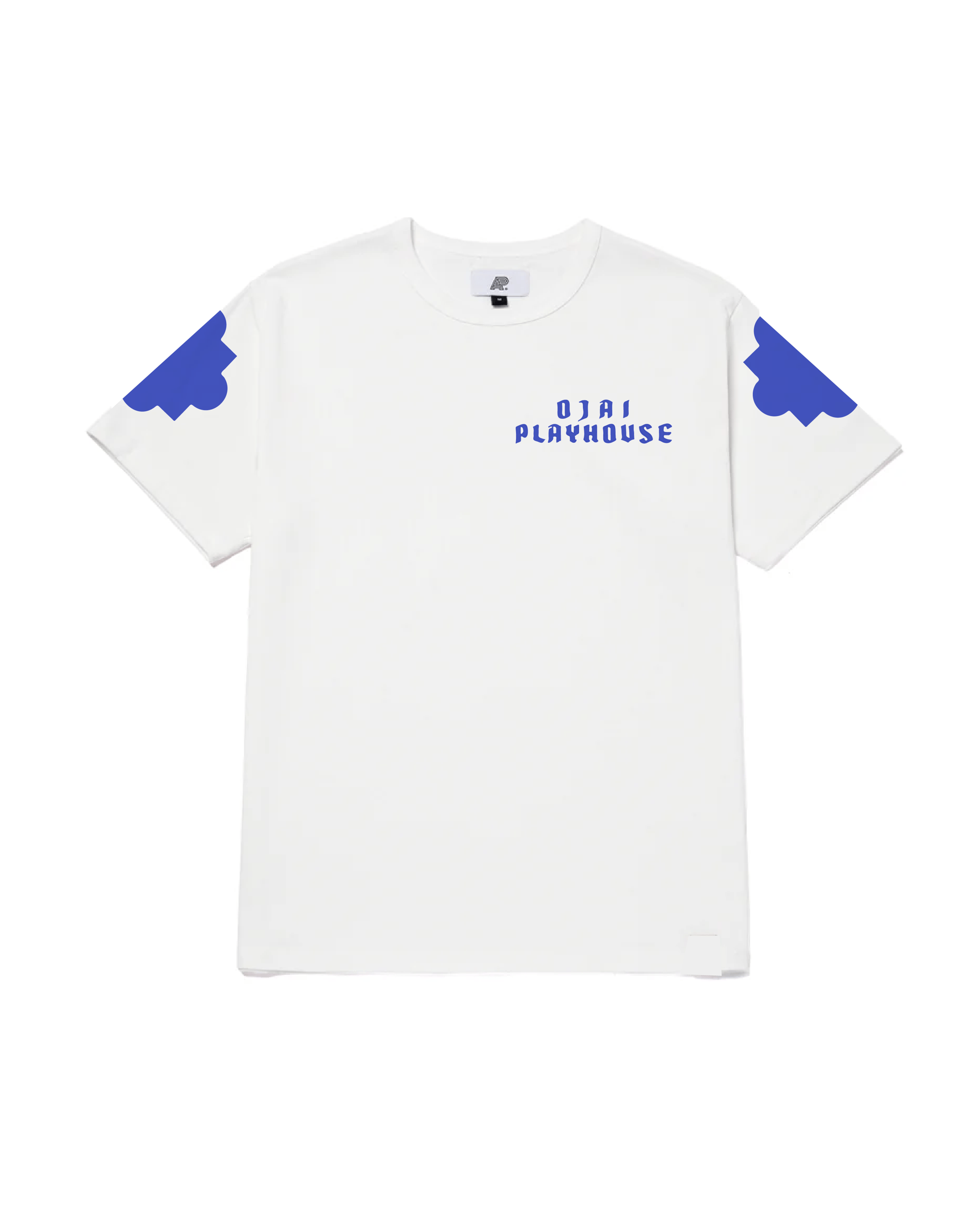 This short sleeve shirt is available in white, and features the Ojai Playhouse quatrefoil on the sleeves and back.